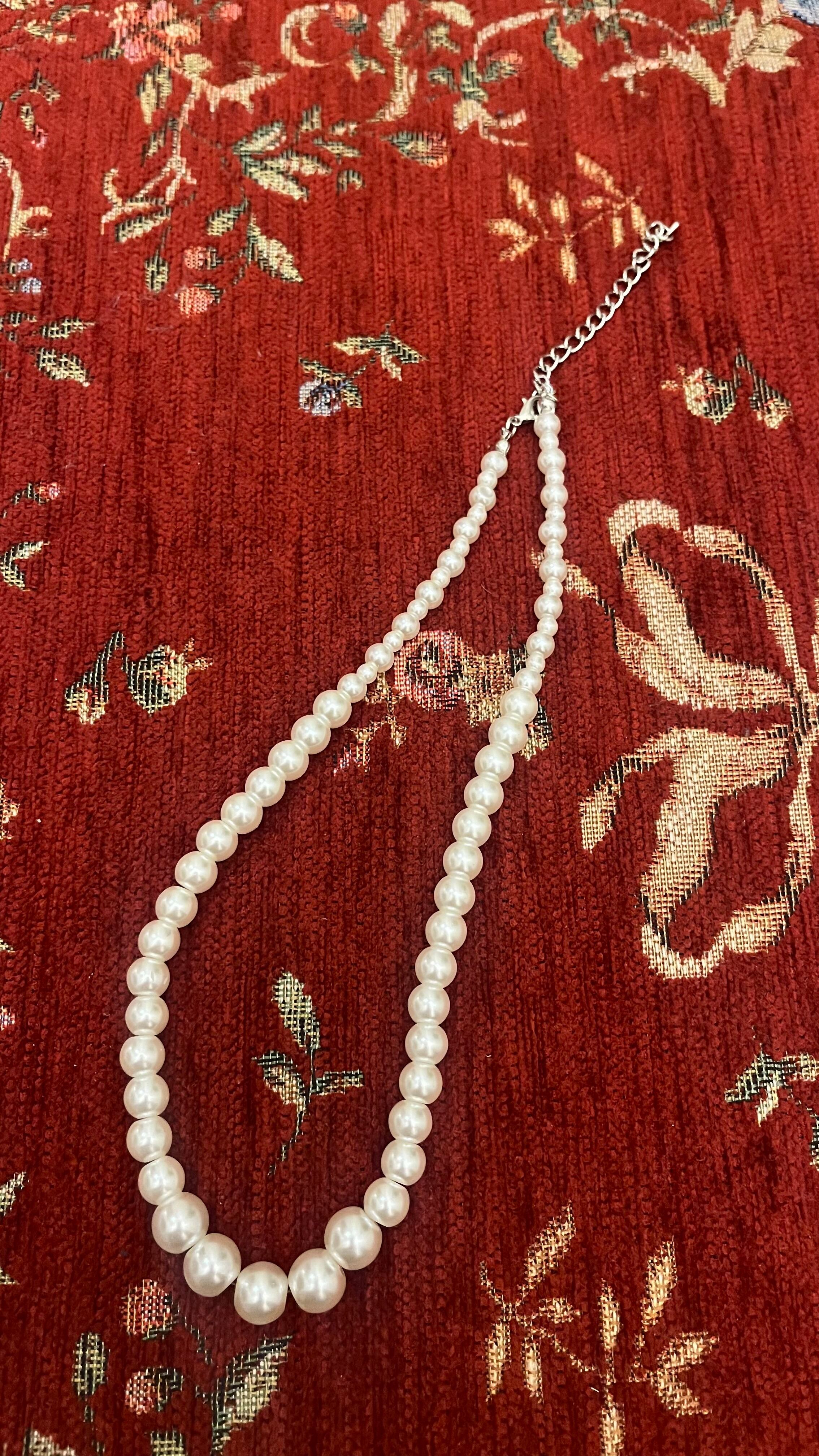 うしろの金具に向けて小さくなる、グラデーションのプラスチックパールのネックレスです。